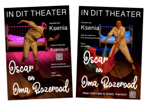 Ksenia - algemeen Oscar en Oma Rozerood Theatermaken is meer dan een voorstelling maken 17 mei 2022 Vanaf 9 juni 2022 speel ik ruim twee jaar de toneelvoorstelling ‘Oscar en Oma Rozerood’ in theaters door heel Nederland. Die voorstelling maakte ik tijdens de lockdown in 2021. Maar theatermaken is meer dan een verhaal en teksten, want je moet ook aan de slag met: folders, posters, persberichten, website, techniek en niet te vergeten […] Lees verder »