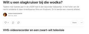 Ksenia - algemeen Natuur heeft weinig waarde 17 oktober 2025 Het westen is verrot en Amerika is de belichaming van het grote kwaad. Dat leerden we vroeger op school in de Sovjet-Unie. We renden regelmatig naar schuilkelders als oefening voor het moment dat de bom zou vallen. Want het was onvermijdelijk dat onze mooie USSR door het arrogante westen naar de steentijd zou worden gebombardeerd. […] Lees verder »