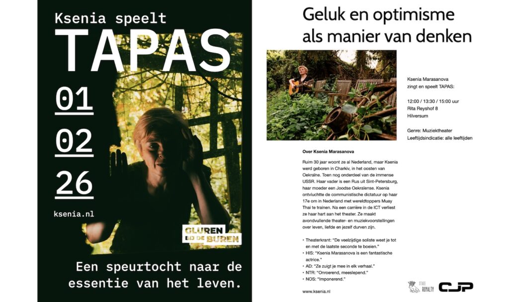 Zondag 1 februari speel ik TAPAS in de grote woonkamer van de familie Vennix in Hilversum aan de Rita Reyshof 8. De drie voorstellingen zijn onderdeel van festival Gluren bij de Buren en duren elk zo’n 30 minuten. Ik start om 12:00, 13:30 en 15:00 uur.